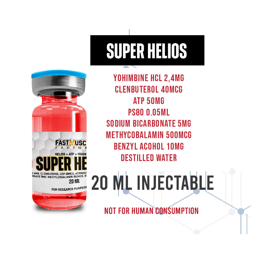 Super Helios es una mezcla inyectable de 20 ml que combina potentes ingredientes termogénicos y energéticos como Albuterol, ATP y Yohimbina, junto con cofactores metabólicos que mejoran la quema de grasa y el rendimiento físico. Diseñado para atletas en fases de corte o definición que buscan resultados rápidos y visibles, sin comprometer energía ni rendimiento.